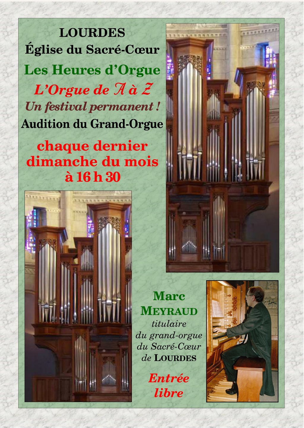Marc Meyraud, titulaire du grand orgue du Sacré-Cœur propose un festival permanent d’une heure.
